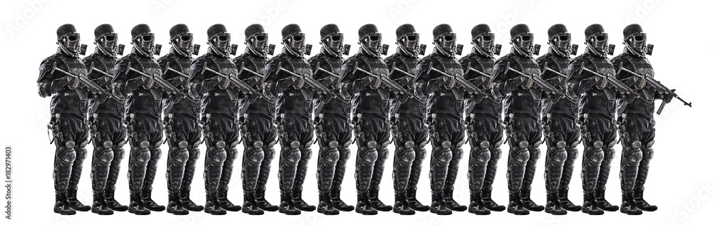 Line of futuristic nazi soldiers in gas mask and steel helmet with schmeisser handgun isolated on white studio shot full length portrait