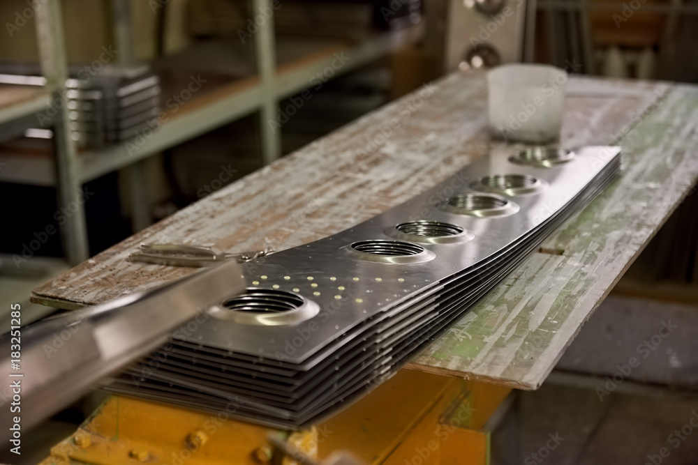Aircraft parts on workshop desk. Steel panels, airplane fuselage.