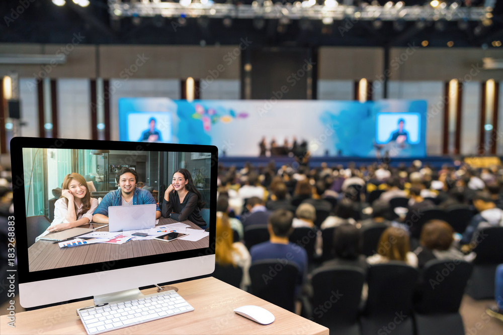 Computer set showing the Group Of AsianBusiness people with casual suit making the conference call over the blurred photo of seminar room with attendee background, business and education concept