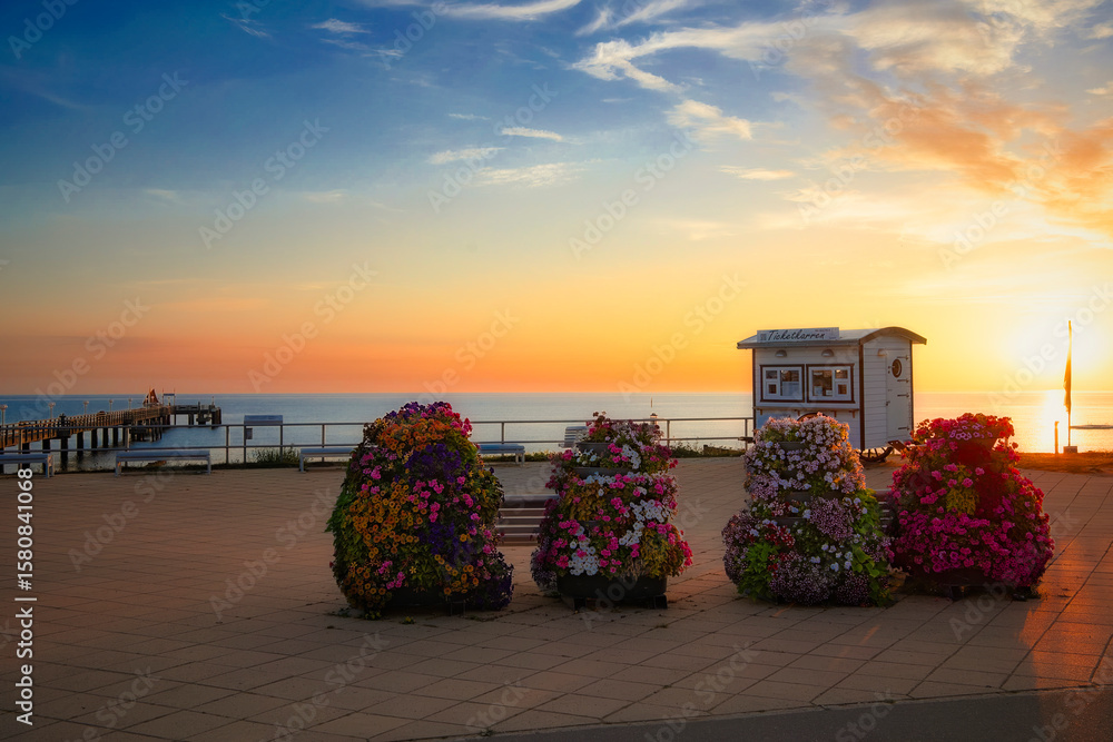 A mesmerizing sunset filters through forest branches, casting golden rays across wildflowers. Warm hues dominate the scene, creating a dramatic interplay of light and shadow in the twilight landscape