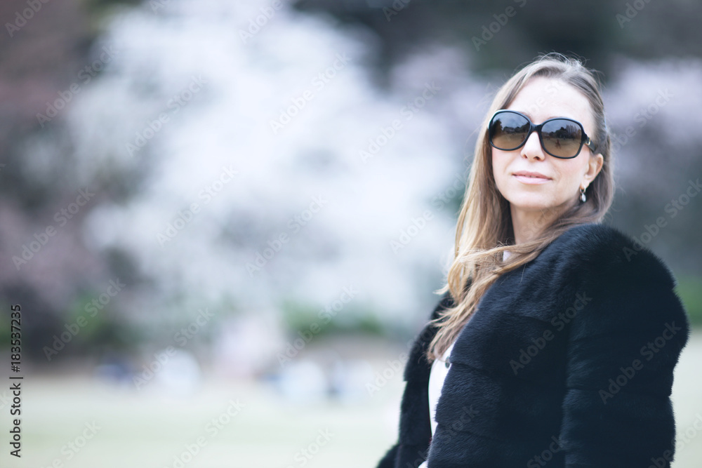Portrait of a young beautiful woman in a fur jacket outdoors