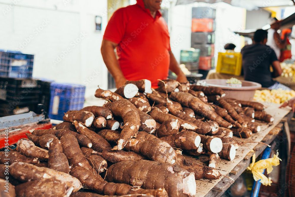 Manioc or cassava - Manihot esculenta - for sale at local farmers market in Brazil