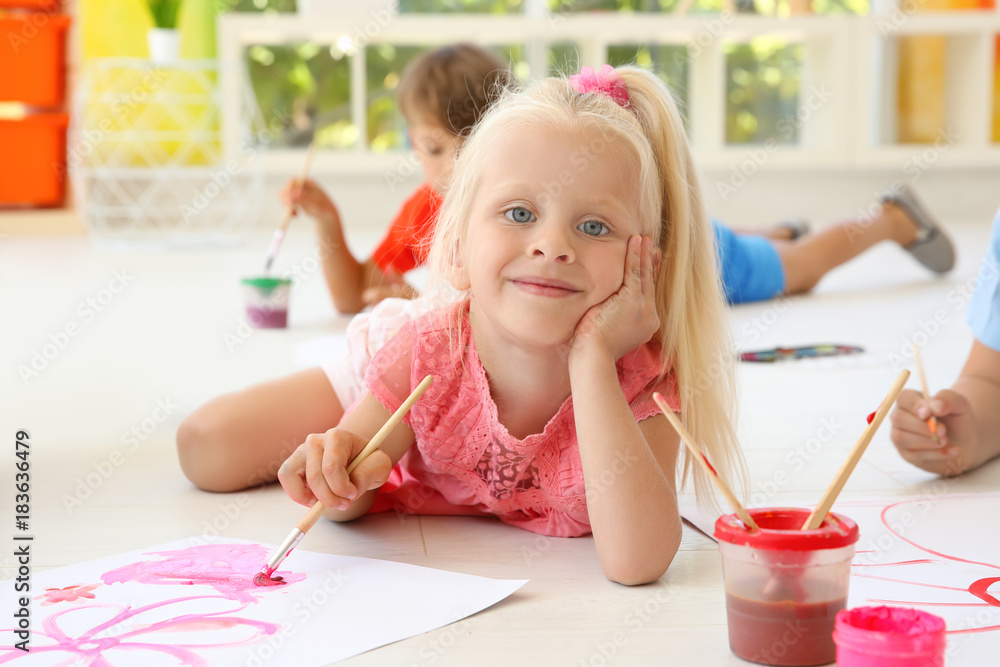 Little girl lying on floor in light room and painting