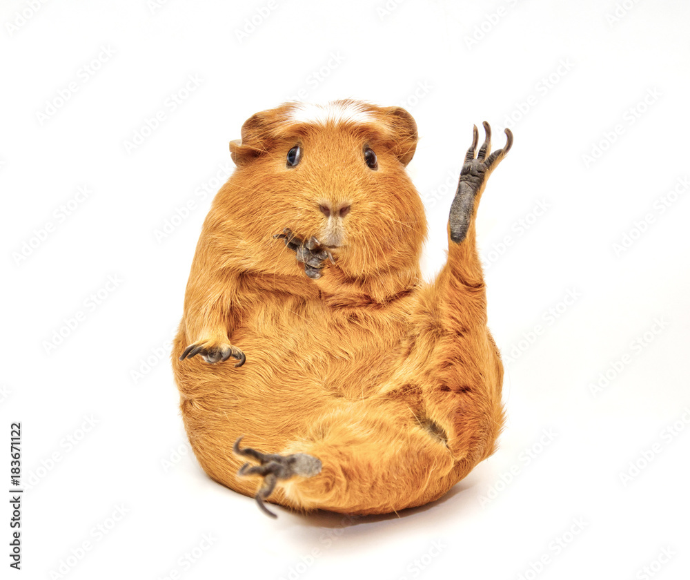 Karate guinea pig (guinea pig sitting in a funny pose as if doing karate) isolated on white