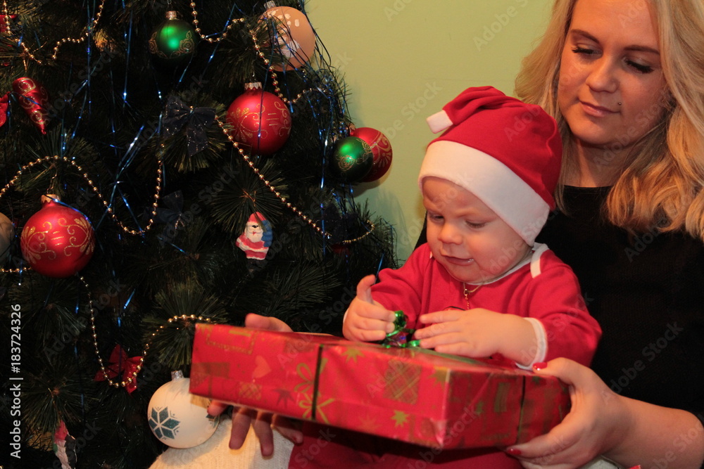 Happy cute little baby in Santa's costume near Xmas tree decorating