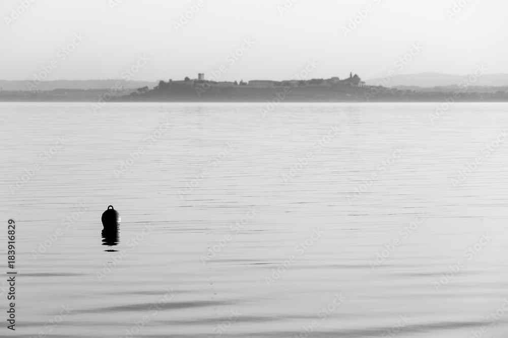 A red buoy on Trasimeno lake at sunset, with Castiglione del Lago town (Umbria) in the background