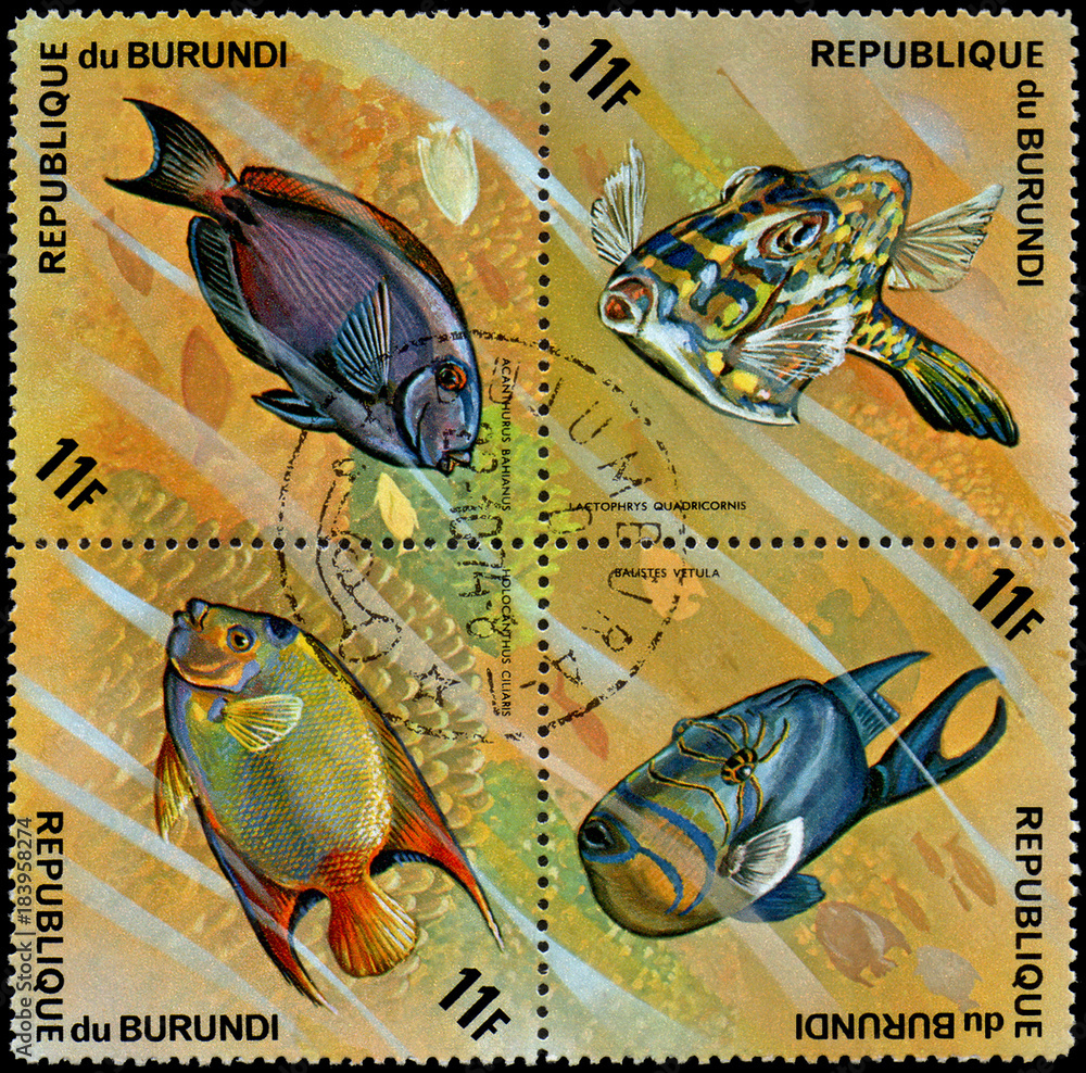 REPUBLIC OF BURUNDI - CIRCA 1974: stamps, printed in Burundi, shows a fishes: Balistes vetula, Holocanthus ciliaris, Acanthurus bahianus, Lactophrys quadricornis