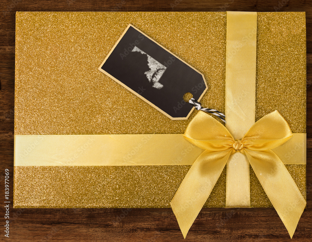A gift box with Maryland drawn on a label with chalk.(series)