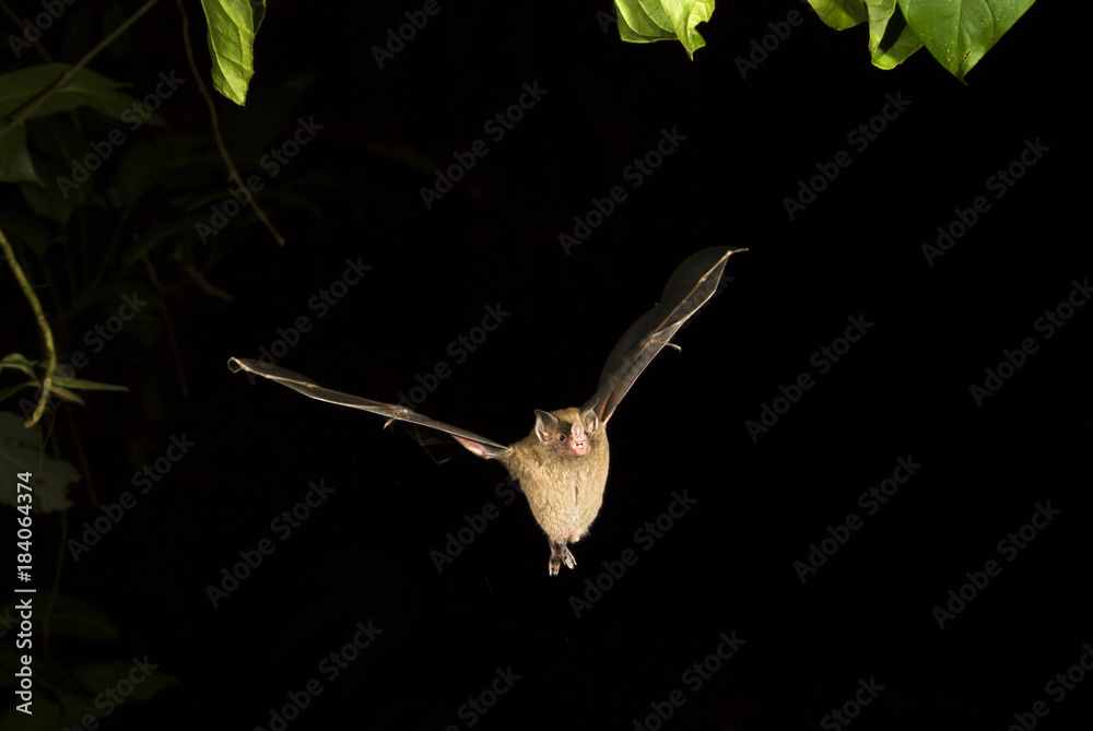 Seba's short-tailed bat (Carollia perspicillata) flying at night, Tortuguero, Costa Rica.