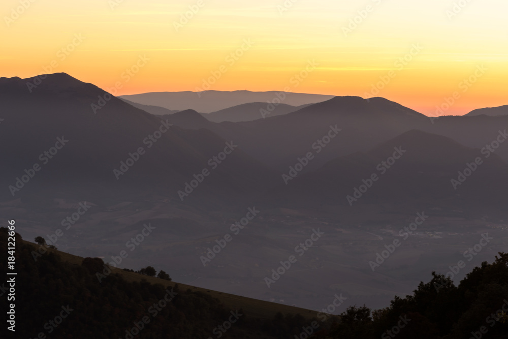 Silhouette of mountain layers at sunset near Canfaito (Marche), under an empty sky with beautiful tones and colors
