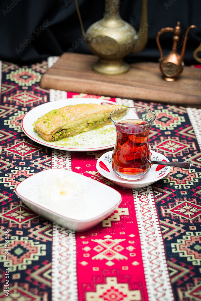 Turkish baklawa with ice cream and pistachios and tea in pear shaped glass. Oriental style arrangement with vintage jars on ethnic table cloth, copy space still life