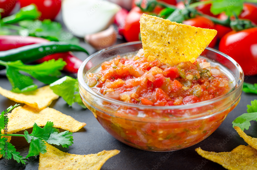 Traditional mexican homemade salsa sauce with ingredients, tomat