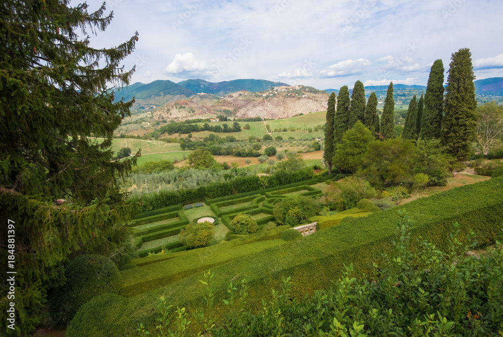 Castelnuovo di Farfa, Italy - A very little medieval town in province of Rieti, Lazio region, central Italy. Here in particular the garden of Palazzo Salustri Galli with landscape