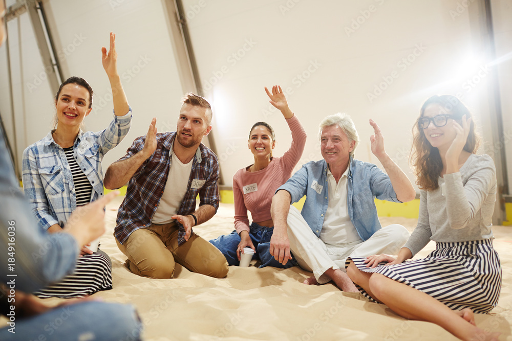 Participants of seminar raising hands to ask question to speaker after report