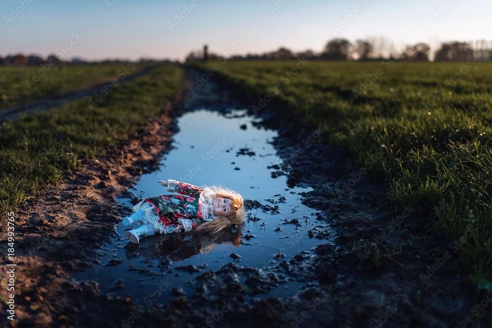 Vintage china doll lying in dirt puddle in rural landscape.