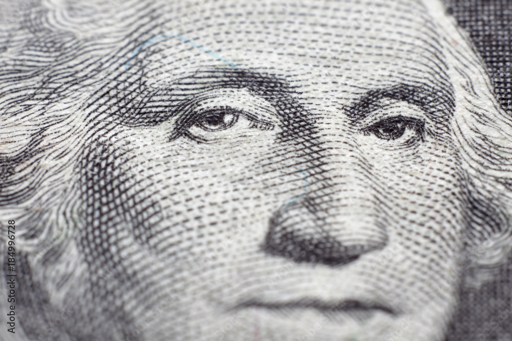 US president George Washington face portrait on the USA one dollar note with extreme macro