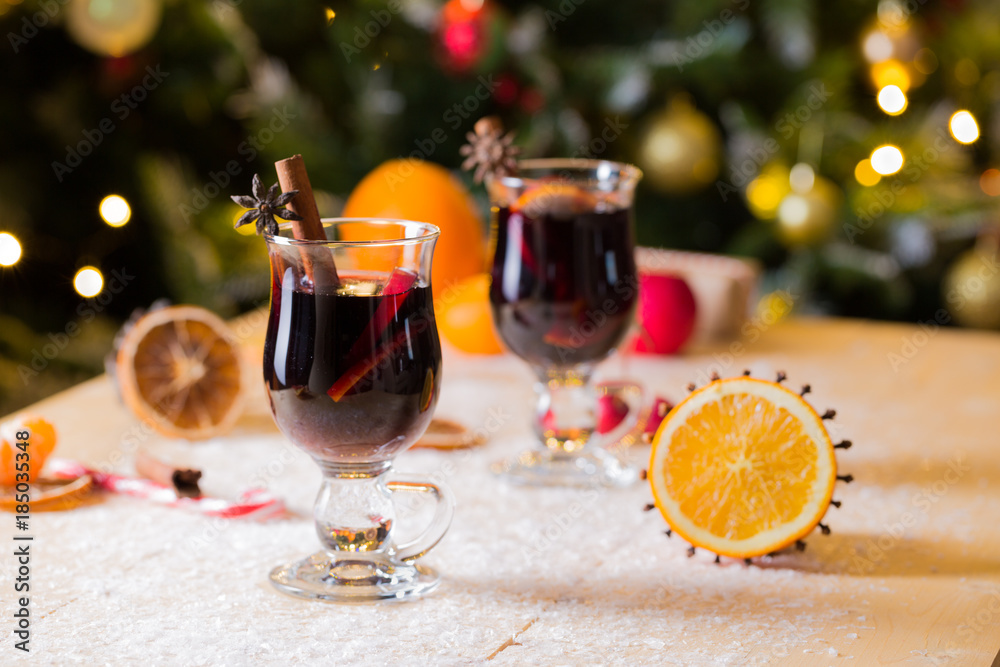 Two high glasses of christmas mulled wine with red apples, orange slices, cinnamon sticks and spices on wooden table with bokeh background. Selective focus.