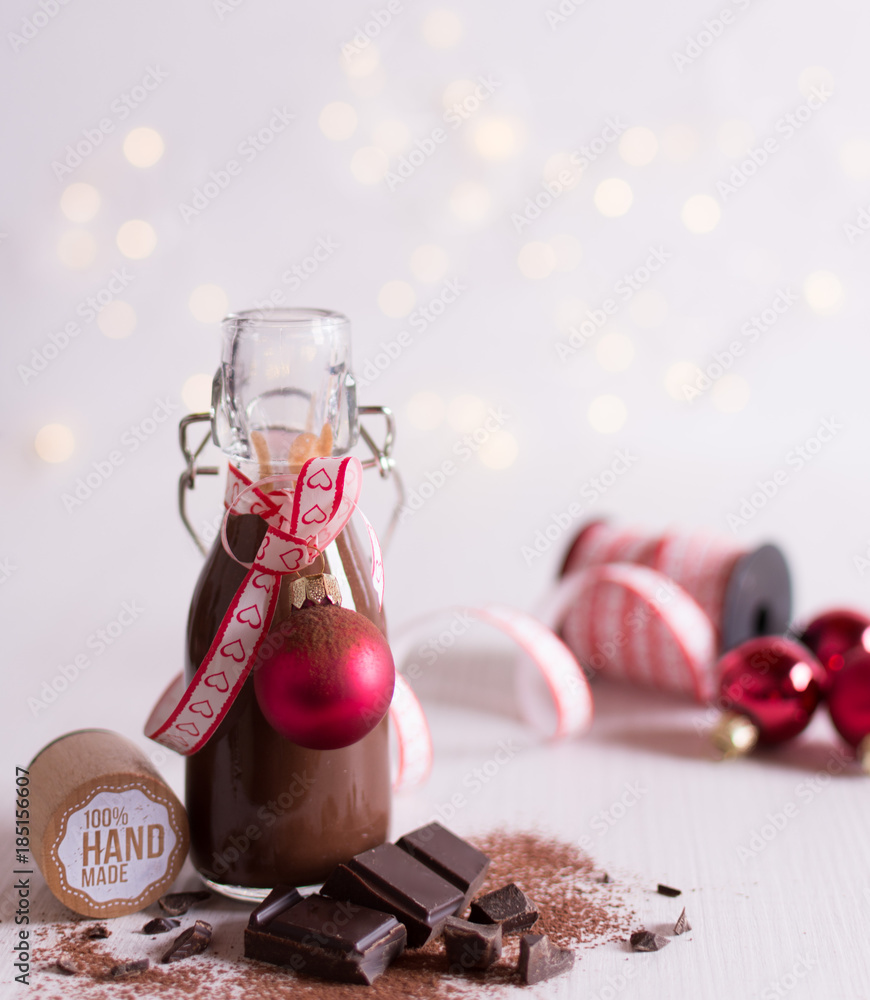 Chocolate liquor in little glass bottles. Idea for Christmas drinks, homemade and wrapped with christmas decorations. Christmas lights in the background.