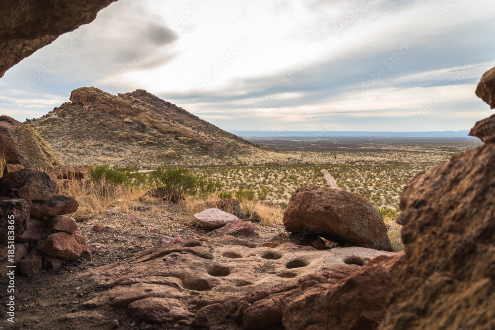 Landscape view from the inside of a cave at Pena Blanca in the Organ Mountainsnear Las Cruces, New Mexico.
