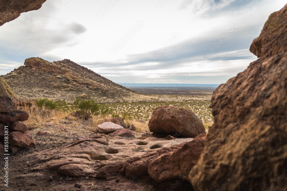 Landscape view from the inside of a cave at Pena Blanca in the Organ Mountainsnear Las Cruces, New Mexico.