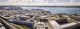 180 degree aerial panorama of Old San Juan, Puerto Rico with harbor in the background.