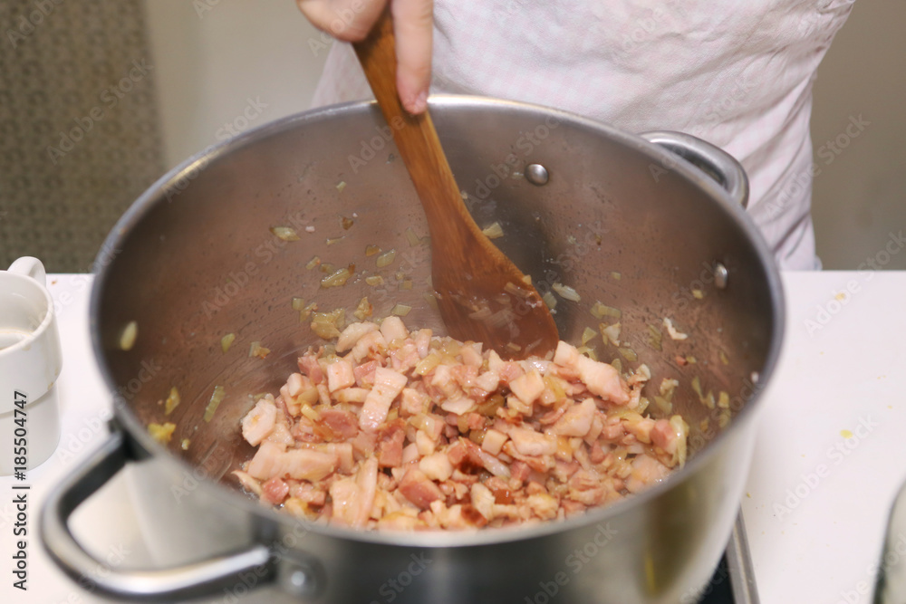 bekon filling sauce cooking in big iron pan with hands and wooden spoon