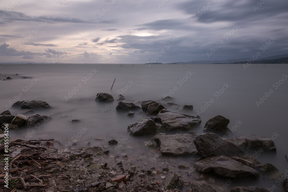 A minimalist, long exposure photo of some big rocks in Trasimeno lake (Umbria), with perfectly still water and cloudy sky