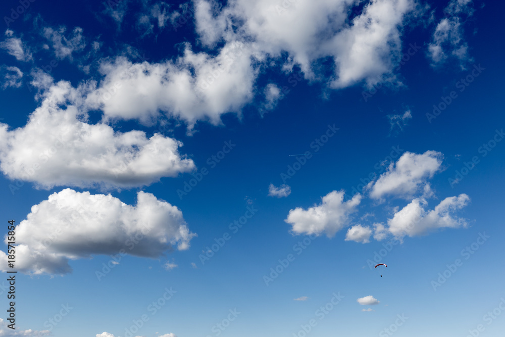 A paraglider flying against a beautiful deep, blue sky, with big white clouds
