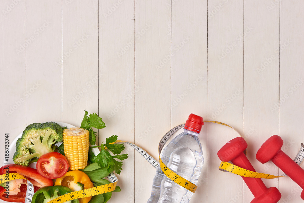 Bell pepper with measuring tape, dumbbells and bottle of water, isolated on white