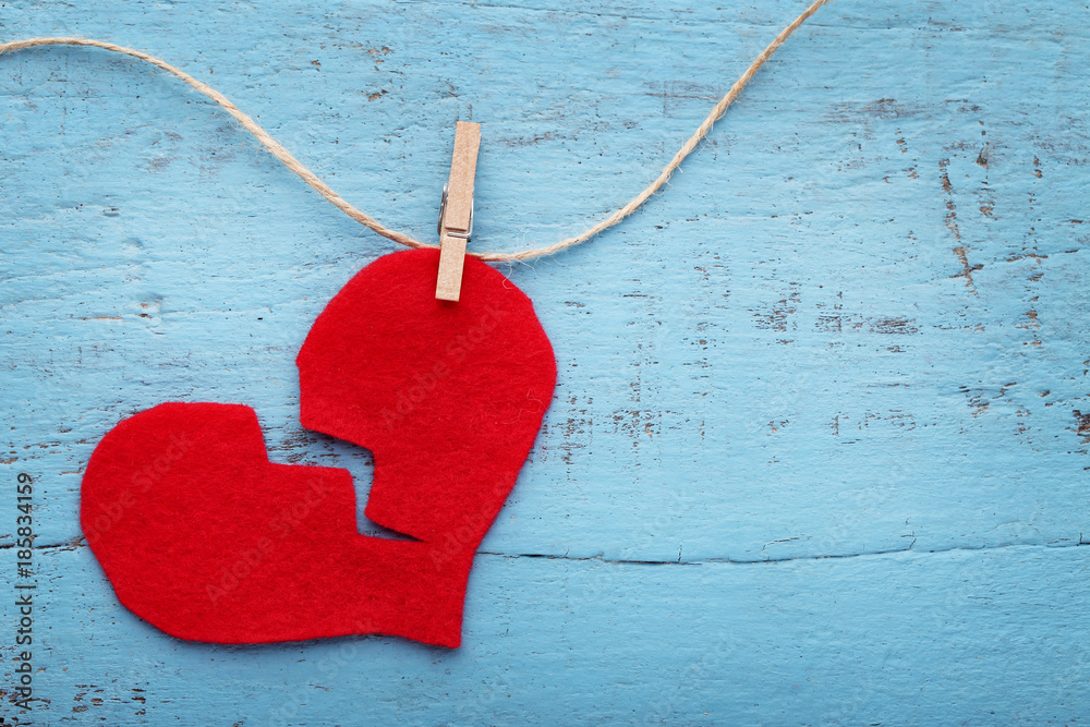 Broken red heart hanging on rope on blue wooden table