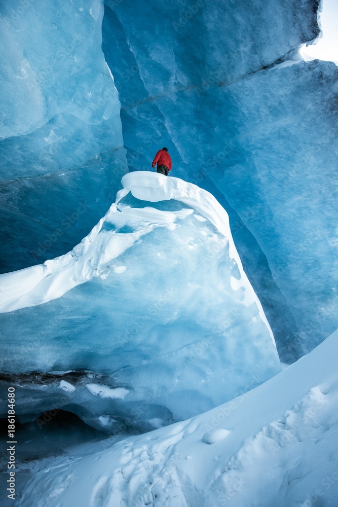A man surrouned by textured blue ice and snow deep in an Ice Cave in Canada