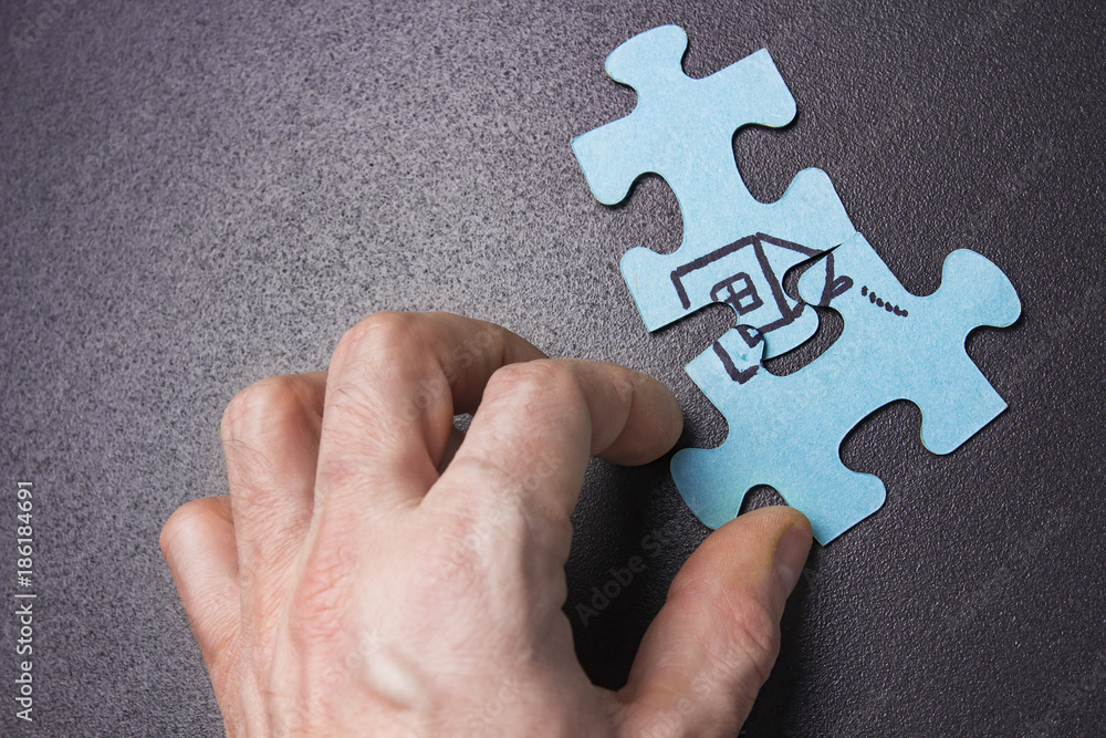 person's hand piles up puzzle with house close-up. Concept house. Construction and home insurance.