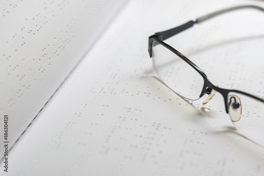 Braille book for low vision/ blind person reading the sign, eyeglasses background.