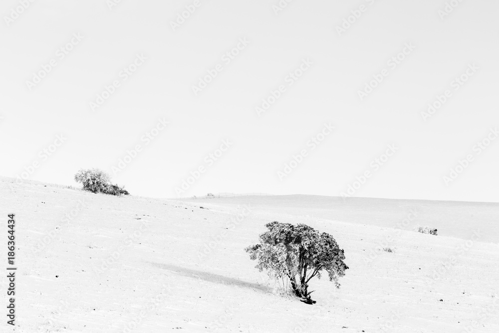 An isolated little tree in a mountain field totally covered by snow, beneath an empty sky