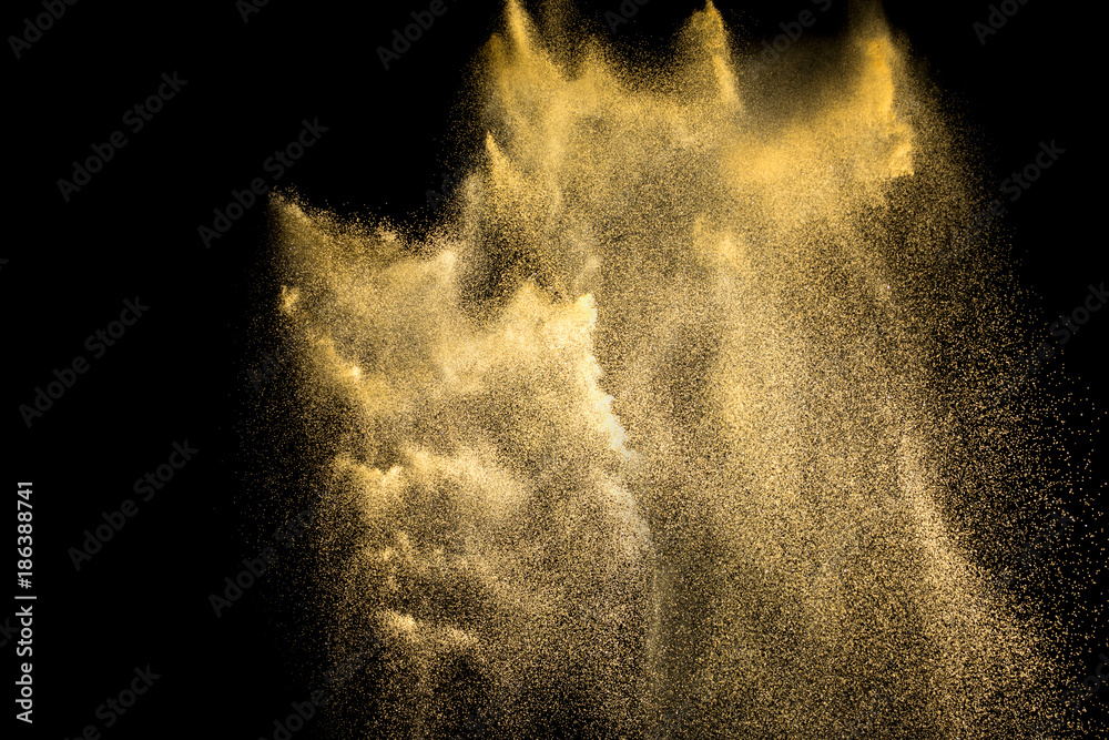 Golden sand explosion isolated on black background. Abstract sand cloud. Golden colored sand splash agianst dark background. Yellow sand fly wave in the air.