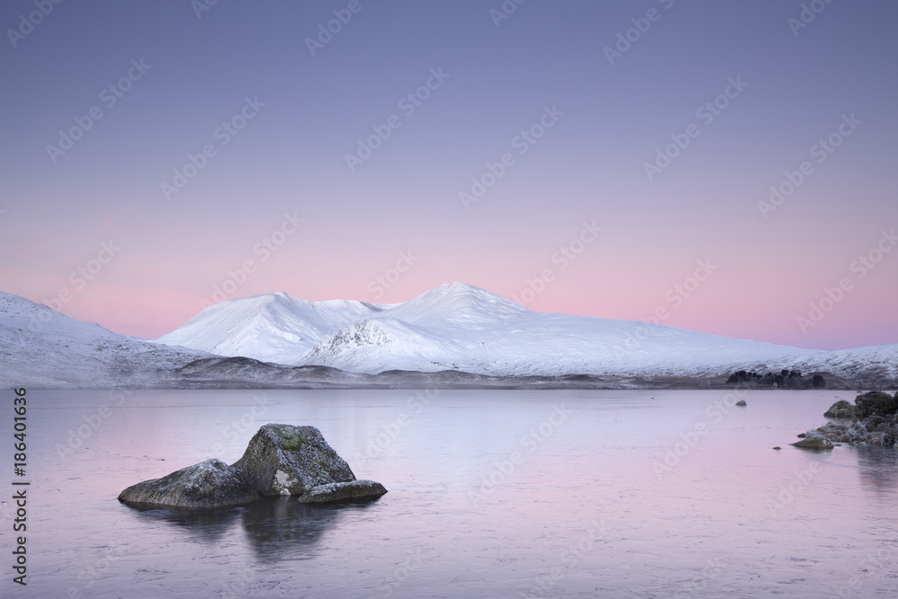 Loch at sunrise Rannoch Moor Glencoe Scottish highlands