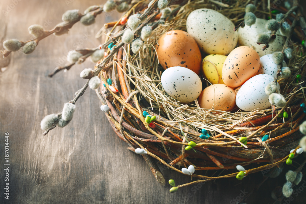 Happy Easter. Congratulatory easter background. Easter eggs and flowers.