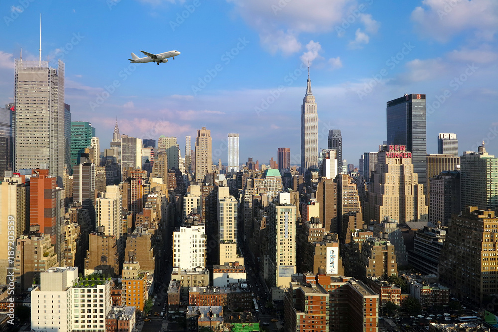 View of midtown of Manhattan on sunset. Plane flies over skyscrapers of New York City, Manhattan
