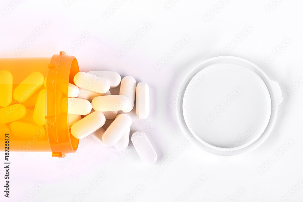 Pills spilling out from yellow container. White medical pills spilling out of transparent pills bottle, white background.