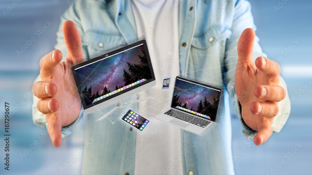 Devices like smartphone, tablet or computer flying over connection network - 3d render