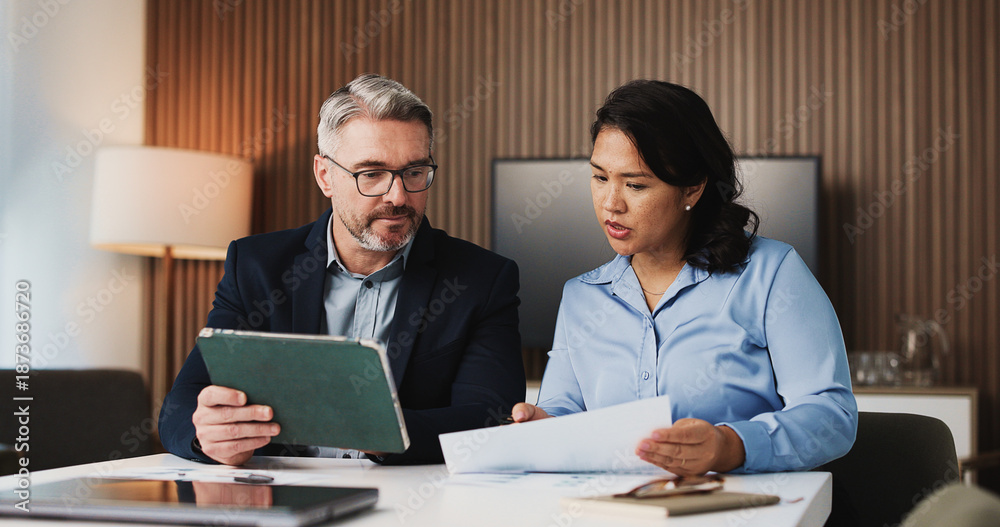 Laptop, meeting and business people in office with advice, review or feedback on legal project. Collaboration, tech and team of attorneys with planning, discussion and together for law case research
