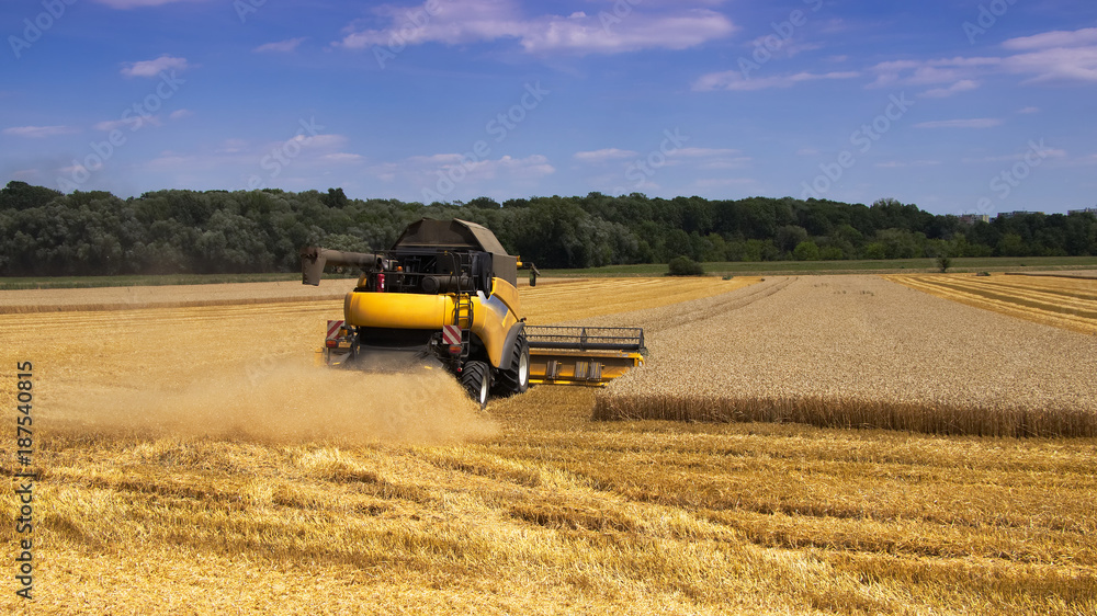 Combine harvester machine harvesting ripe wheat crops. Produce of wheat at farmland. 16:9 aspect ratio