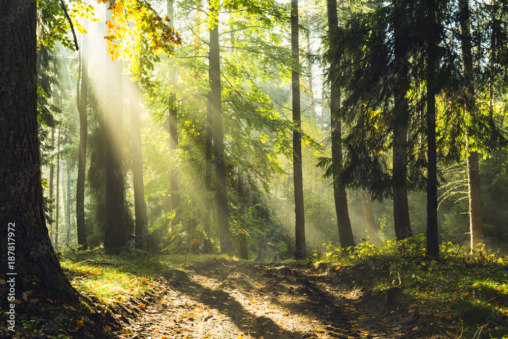 Forest sun rays wild road / God beams ,old natural green forest in north Poland