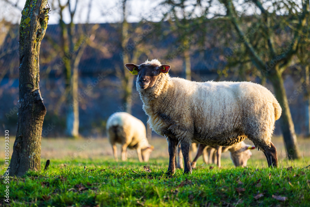 Sheep grazing in winter in an apple orchard typical of the Norman bocage in Proussy (Condé-en-Normandie)