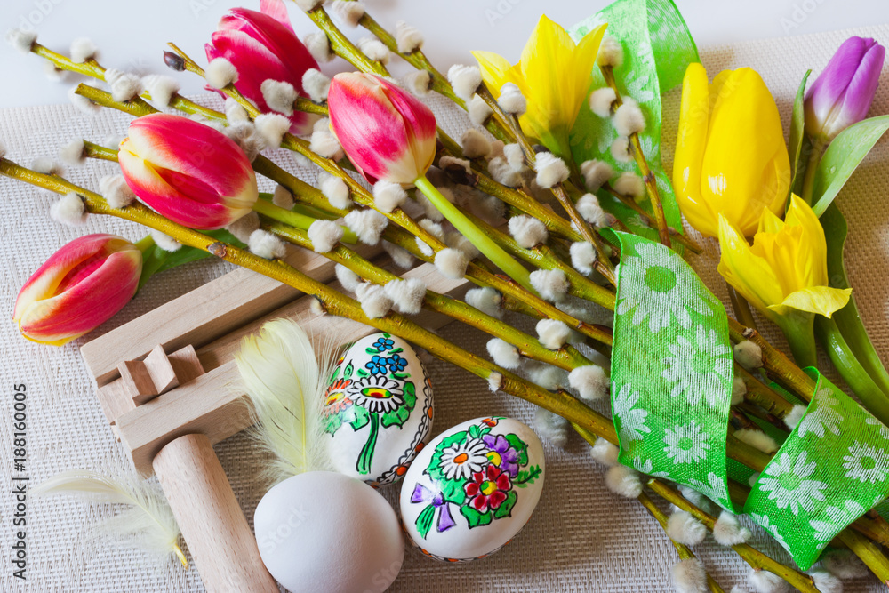Czech traditional easter decoration, my own homemade painted eggs in the nest with flowers and rattlesnake music instrument
