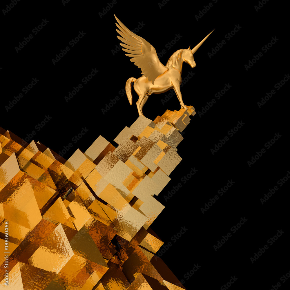 Pegasus on gold cube mountain . start up, illustration concept of leader on a market.3d rendering. 3d illustration.