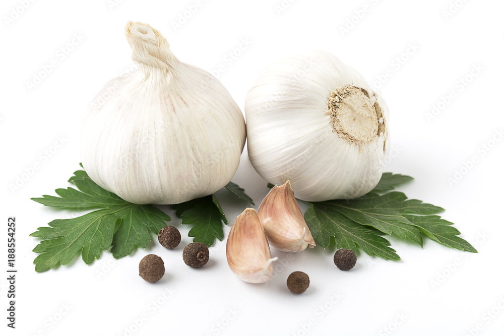 Fresh garlic with black pepper and parsley isolated on white background. Raw garlic