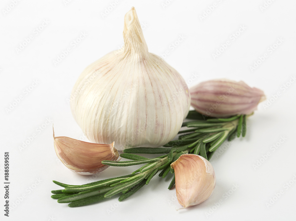 Fresh garlic with rosemary isolated on white background. Isolated garlic