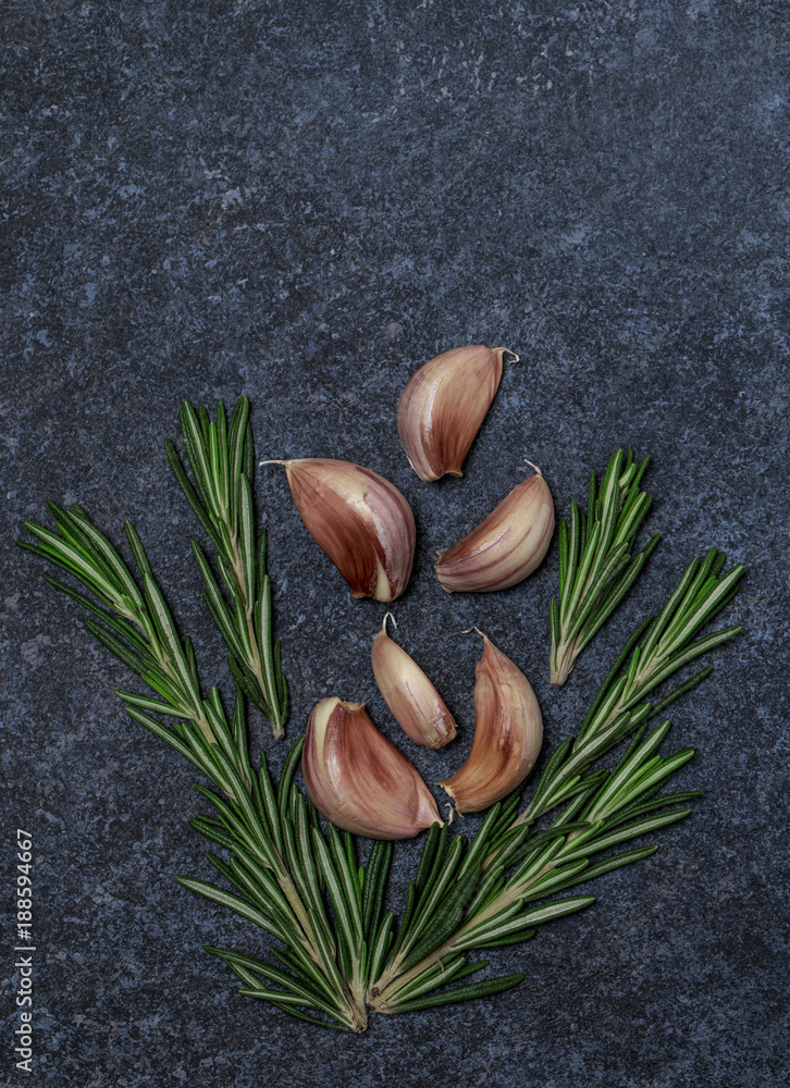 Fresh garlic with rosemary on wooden background. Garlic bulbs