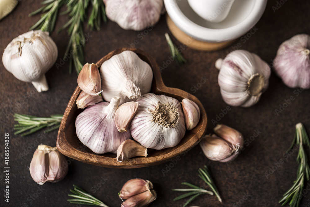 Fresh garlic with rosemary on wooden background. Garlic bulbs